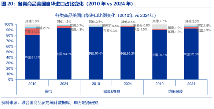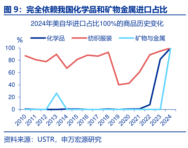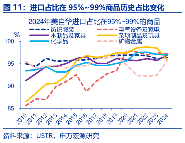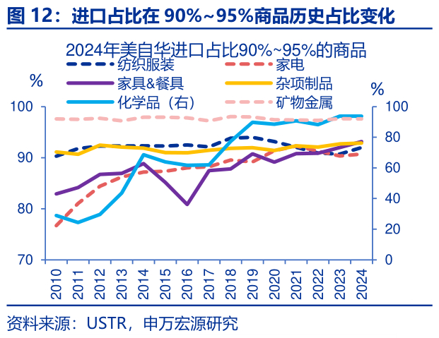 趋势上看,美国对华“极高依赖”的商品可分为长期持续依赖型(杂项制品、家电、纺织服装、家具&餐具)和短期加速依赖型(化学品、矿物金属)。为观察美国对华进口依赖度的历史变化趋势,我们将2024年美国自华进口占比超90%的98个商品分为三档:100%、95%~99%、90%~95%。数据显示,美对华进口占比达100%的化学品和矿物金属,依赖度在短期内急剧上升,分别从2022年的7.7%和0%跃升至2024年的100%。今年以来,这两个商品的美对华依赖度仍接近100%。此外,2024年美自华进口占比在90%~95%的化学品,依赖度在过去数年也显著提升,从2010年的28.9%升至2024年的93.8%。