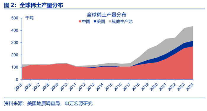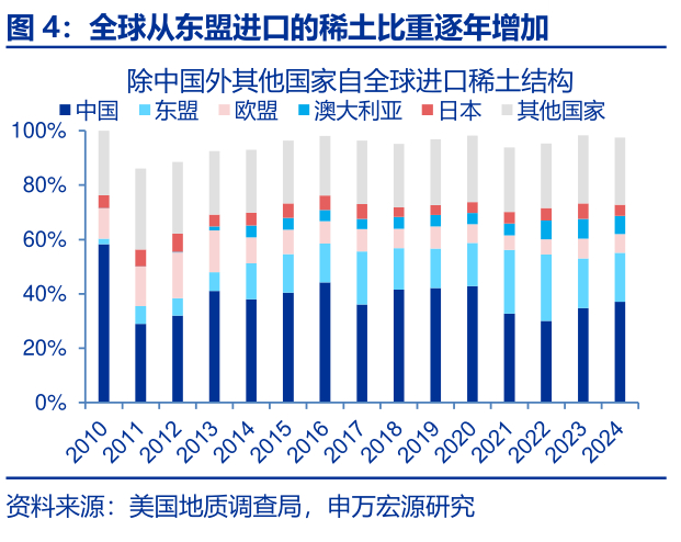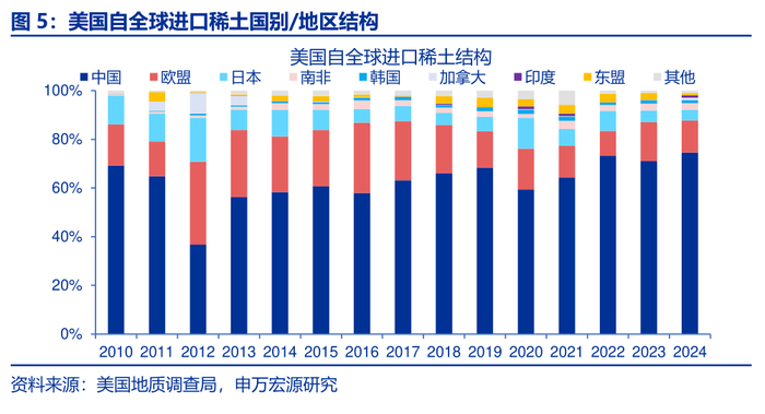 我国稀土产量占全球70%,且在全球稀土进口格局中占据主导地位。过去近20年,我国稀土产量持续占据绝对优势。最新数据显示,2024年我国稀土产量高达27万吨,占全球总产量的68.5%。从全球其他国家的稀土进口格局来看,我国同样占据着绝对优势。2024年全球其他国家自我国稀土进口占比达37.1%,远高于第二大进口地区东盟的18.0%,尽管东盟比重逐年上升,但仍与我国差距较大。此外,尽管经历了多次中美贸易冲突,美国对华稀土的依赖度依然居高不下,近年来基本稳定在75%左右。