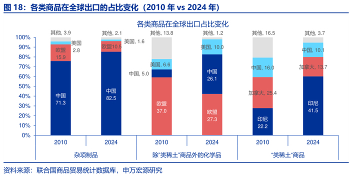 视角二:中国对全球出口比例高,且在海外供应中的重要性显著增强,譬如化学品。过去20年,除“类稀土”和化学品外,中国其他商品出口占比稳居全球首位。印尼虽为“类稀土”出口第一,但主要流向中国,体现两国产业链深度嵌套。2024年化学品出口虽为全球第二,但与第一差距微小,且较2010年提升了21.1pct,体现其竞争力显著增强。