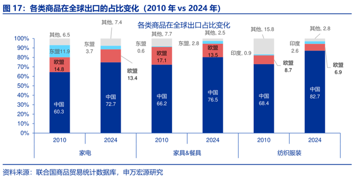 视角二:中国对全球出口比例高,且在海外供应中的重要性显著增强,譬如化学品。从中国对全球出口的数据上看,除“类稀土”商品和化学品外,其他商品类别在过去20年中的全球出口占比一直位居第一,且远超出口占比第二的国家。“类稀土”品方面,印尼在全球出口中的占比最高,但其出口主要流向中国,这或反映出我国与印尼在相关产业链上的深度嵌套关系。化学品方面,虽然2024年在全球出口中的占比位列第二,但与排名第一的欧盟仅相差1.2pct。与此同时,化学品在全球的出口比例较2010年大幅提升了21.1pct,反映出我国化学品在全球市场的竞争力显著增强。