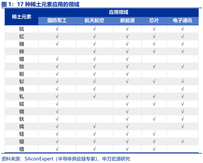 稀土是15种镧系元素以及钪和钇的总称,在军事和高科技领域具有不可替代的作用。具体而言,钐和钇在军工领域应用广泛;钕和镨主要用于新能源领域;铈和镧在芯片制造领域至关重要;镧和钇在航空航天领域发挥关键作用。