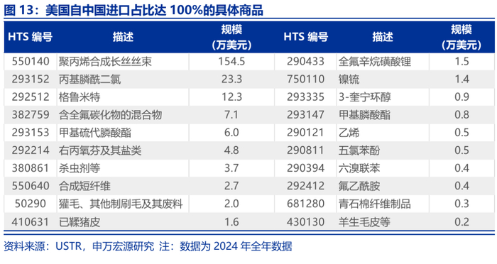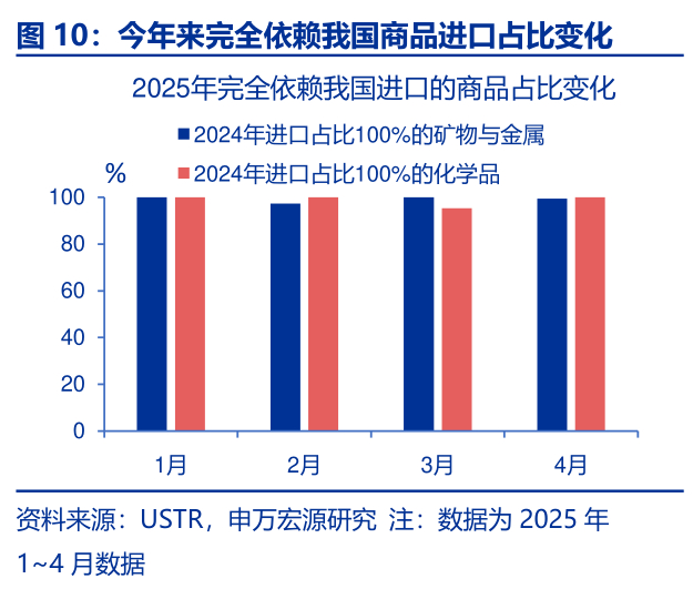 以美国为例,海外在化学品、矿物金属等领域均对中国有“极高依赖”和“完全依赖”的商品。以美国海关的HTS6位商品编码为依据,2024年美国自中国进口占比大于90%的共有98种商品,占美自华总进口的3.5%,规模为162.5亿美元。其中有20个商品的自华进口占比达到了100%,规模为224.9万美元,主要集中在纺服、化学品、矿物金属。