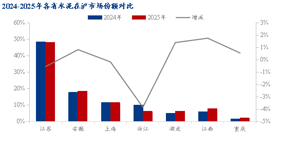 从上海的水泥来源区域看,长三角地区占比达84.0%,同比微降3.7个百分点(其中浙江下降幅度最大,达3.8个百分点)。沿江江西(7.7%,同比+1.8%)、湖北(6.3%,同比+1.4%)、重庆(2.0%,同比+0.4%)占比有所提升,但整体市场格局保持稳定。
