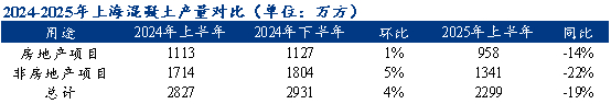 上海市混凝土行业协会数据显示,上半年全市混凝土产量2299万方,同比下降19%。其中,房地产项目用量958万方,同比下降14%(2024年同期降幅为23%);非房地产项目用量1341万方,同比下降22%(2024年同期降幅为6%)。房地产项目降幅有所收窄,但市政、基建等非房项目需求降幅明显扩大。