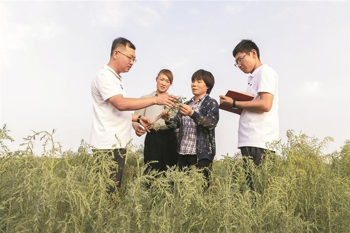 技术人员在二师三十三团盐碱蓬蒿种植地里察看蓬蒿的生长情况(资料图片)。盐地碱蓬每年每亩可以“吃掉”几百公斤盐,治理盐碱地效果明显。目前,在新疆多个地区,盐地碱蓬已实现广泛种植。 兵团日报常驻记者 李嘉成 摄