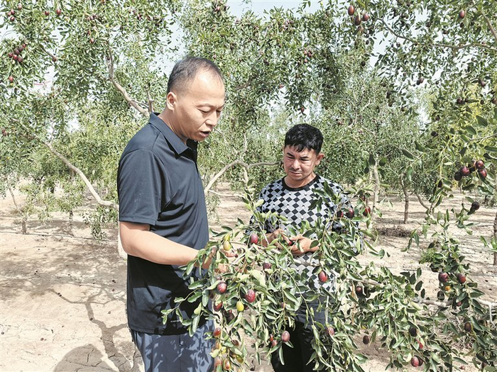 喀什地区巴楚县恰尔巴格乡阿勒台买里村村民(右)在三师四十九团十八连学习红枣种植技术(资料图片)。2023年,中国工程院院士尹飞虎带领团队在四十九团十八连建立了红枣科研实验基地,从2024年开始在330亩枣园里推广应用咸水淡化、竖井排盐、地下滴灌等技术,实现增产增收。兵团日报全媒体记者 常丫丫 摄