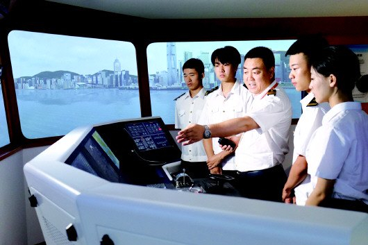山东海事职业学院学生在学校的航海模拟器学习。