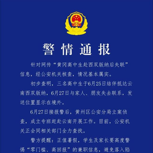 7月16日,湖北黄冈市黄州区公安分局发布关于“3名高中生赴西双版纳后失联”的警情通报: