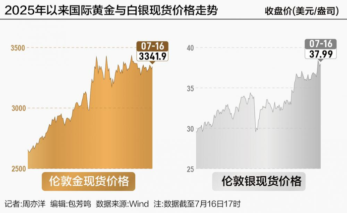 与此同时,截至7月15日,上海期货交易所的白银主力合约价格涨至9225元/公斤,盘中最高触及9267元/公斤,已经连续上涨三周,同样创近14年新高。年初至今累计涨幅达23.5%。