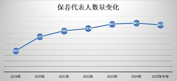 保荐代表人队伍是证券从业人员的核心之一,其数量在2024年底达到最高峰,为8812人,相比2023年底的8632人增加了180人,但自2025年上半年开始也出现了收缩,截至6月30日的数据为8470人,相比去年底净减少了342人,降幅为3.88%。