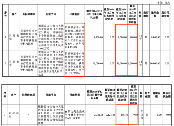 近日,益方生物在回复上交所关于2024年年报的信披监管问询函时披露,贝达药业拖欠其肺癌1类创新药贝福替尼的里程碑款项1.8亿元,逾期时间已近2年。益方生物表示,通过邮件、电话、线下拜访等方式与贝达药业多次沟通,并于2024年底发出正式催款函,但款项仍未到账。截至2024年末,益方生物已按10%的坏账率计提坏账准备1800万元。