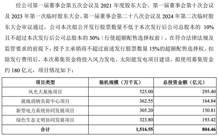 华电新能此次IPO计划募资180亿元,将全部投入风力发电、太阳能发电项目建设,包括风光大基地项目、就地消纳负荷中心项目、新型电力系统协同发展项目、绿色生态文明协同发展项目。这些募投项目拟开发建设的风力发电和太阳能发电项目总投资金额804.46亿元,装机容量1516.55万千瓦。