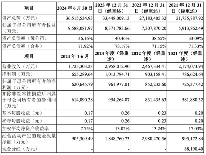财务方面,于2021年度、2022年度、2023年度及2024年1-6月,公司实现营业收入分别约为217.41亿元、246.73亿元、295.80亿元、172.53亿元人民币;同期净利润分别约为78.66亿元、90.32亿元、101.38亿元、65.53亿元人民币。