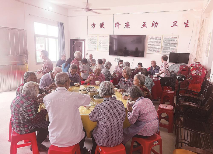 午时,武平县中堡镇大坪村长者食堂飘出阵阵饭香。71岁的戴兆连端着热气腾腾的米饭坐下,红色的大圆桌上摆放着炒肉、炒青菜、炒茄子等菜,老人们围坐说笑,比过年还热闹。“我每天都来,带点自己种的菜,和大家一起做饭吃饭,热热闹闹的。”