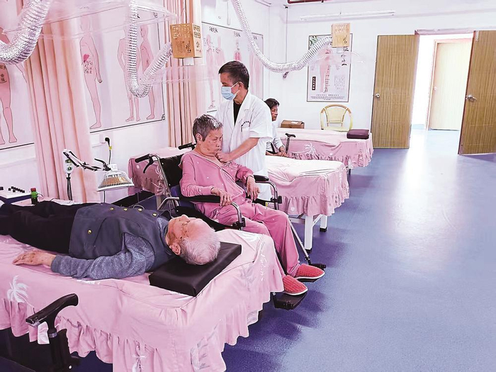 老人们在龙岩市社会福利中心同心圆(香港)护理院内接受中医理疗。