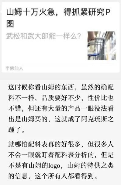 虽然这些能进山姆的国产品牌,模样跟以前长得差不多,但用半佛仙人的话说,同平台的东西亦有差别,武松和武大郎那也是同平台的,山姆最该做的是给特供商品贴个巨大的山姆logo,让喷的人有的可装。