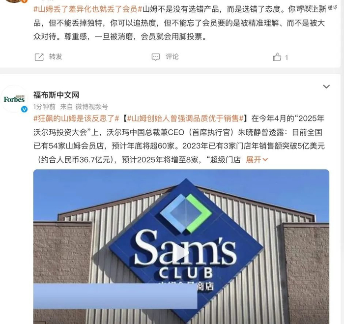 比如“山姆拿什么留住百万会员”,“狂飙的山姆该反思了”“山姆丢了差异化也就丢了会员”,凡此种种,不胜枚举。