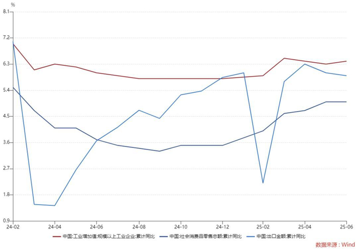 基本面层面,我们考虑国内增长、通胀与流动性的情况。增长层面,一季度数据修复明显,但近期呈现企稳迹象,二季度实际GDP同比增长5.2%,名义增长为3.9%,与去年Q2持平。6月工业增加值累计同比、出口累计同比、社零累计同比分别为6.4%、5.9%、5.0%,较上个月分别上涨0.1%、下跌0.1%,以及维持不变。广发证券认为,工业增加值维持高位可能和关税节奏有关,5月14日中美关税缓和,出口交货值于6月释放。社会零售较低,仍与餐饮、烟酒、饮料、化妆品领域大幅回落,以及国补促销政策的扰动有关。往后观察,二季度实际增长数据为全年打下了良好基础,主要短板还是物价下滑带来的名义GDP不足,这影响了大家的微观体感,也可能是反内卷政策升温的重要背景之一。