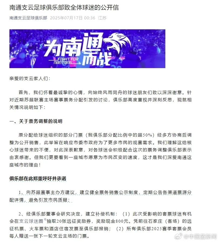 7月17日,南通支云足球俱乐部发布致全体球迷的公开信:原分配给球迷组织的部分门票(我俱乐部分配比例中的超50%)经多方协商后调整为公开销售,此举旨在响应市委市政府为了更多市民的观赛需求。我们理解这给核心球迷带来的不便,对此深表歉意,对各球迷会积极配合这次的票务调整俱乐部表示由衷感谢。但我们更要看到一座城市愿意为市民改变的速度,这才是我们深爱南通这座城市的理由!