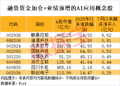 资金面上,7月以来融资净买入超千万元的有8只。其中, 鹏鼎控股 获融资净买入额最高,达到6.62亿元; 道通科技 、完美世界、国脉科技、 泓博医药 、 浙文互联 等融资净买入均在1亿元以下。
