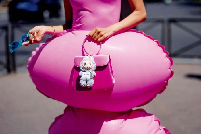 2025年6月28日,法国巴黎男装周2026春夏系列期间,女演员帕特里夏·孔特雷拉斯携泡泡玛特LABUBU玩偶,搭配亮粉色皮革手袋出现在爱马仕店外。图/视觉中国