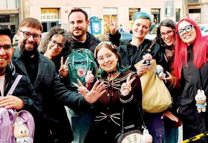 上图:西班牙巴塞罗那的潮玩粉丝展示他们的LABUBU玩偶。本版图/受访者提供