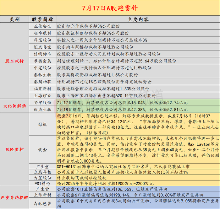 导读:财联社7月17日投资避雷针,近日,A股及海外市场潜在风险事件如下。国内经济信息方面包括:1)雪糕刺客钟薛高资不抵债,已被申请破产;2)暑期档过半,尚无电影票房突破10亿;公司方面重点关注包括:1)*ST广道6月25日至7月16日股价累涨偏离北证50指数251.64%,公司股票自2025年7月17日起停牌核查;2)广生堂表示,GST-HG131被药审中心纳入突破性治疗品种名单,不代表能获批上市;海外市场重点关注包括:1)纳斯达克中国金龙指数收跌1.41%;2)阿斯麦跌超8%,公司称美关税政策致使公司增长前景不明。