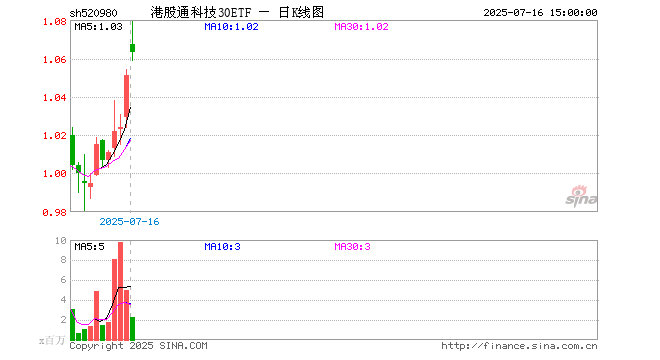 7月16日,港股通科技30ETF(520980)涨1.14%,成交额2.44亿元。当日份额增加100.00万份,最新份额为15.21亿份。最新资产净值计算值为16.03亿元。