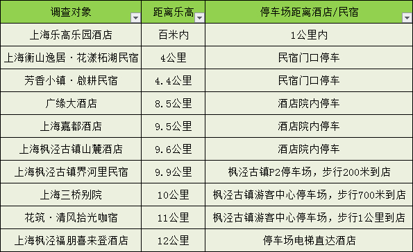 交通配套:本次调查中的酒店/民宿距离乐园4-13公里,推荐自驾前往,除“上海三桥别院”外,其余酒店/民宿停车免费。枫泾福朋喜来登酒店、上海枫泾古镇界河里民宿为住店客人提供乐高乐园免费接送服务。