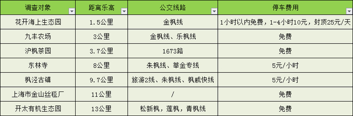 交通配套:本次调查中的景点距离乐园1.5-13公里,除“金山丝毯厂”外,均有公交线路可达。如自驾前往,可参考以下收费标准。