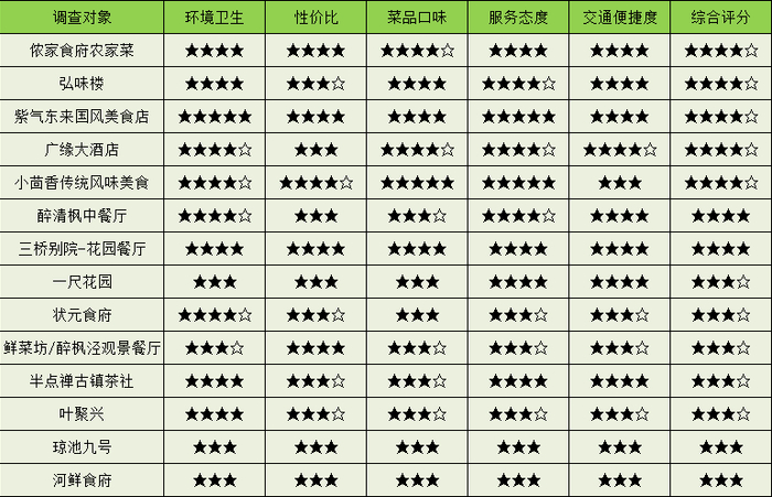 餐饮企业的环境卫生、性价比、菜品口味、服务态度、交通便捷度等至关重要,经评定,14家餐饮企业中有5家综合评分达到四颗星以上。