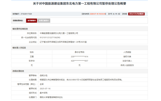 根据军队供应商管理相关规定,自2025年07月16日起暂停中国能源建设集团东北电力第一工程有限公司参加全军物资工程服务采购活动资格。