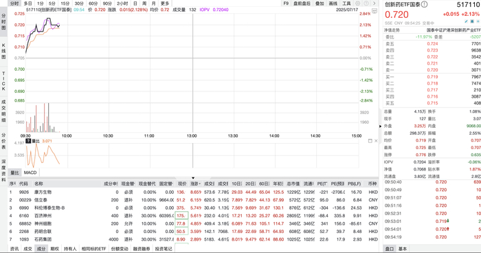 今日沪深两市持续震荡,上证指数在3500点附近徘徊。创新药概念领涨,覆盖A股港股优质上市创新药企的创新药ETF国泰(517110)涨幅超2%,持仓股康方生物、信立泰等接近涨停。