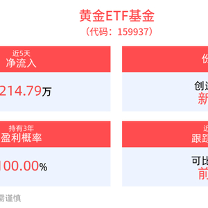 资金流入方面,黄金ETF基金最新资金净流入1107.13万元。拉长时间看,近5个交易日内有4日资金净流入,合计“吸金”8214.79万元,日均净流入达1642.96万元。