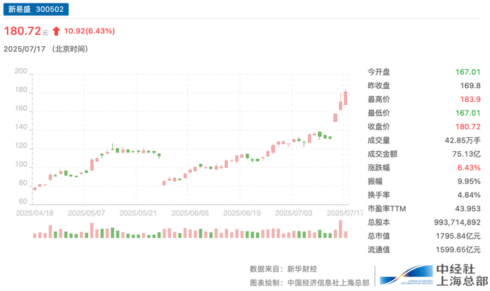 据新华财经统计,6月以来A股CPO板块内牛股频出,截至7月16日收盘,区间涨幅超过50%的个股就有7只。其中,新易盛以92.36%的区间涨幅居首,中际旭创(300308.SZ)、长芯博创(300548.SZ)和仕佳光子(688313.SH)则分别以83.51%、77.8%和64.03%的涨幅紧随其后。