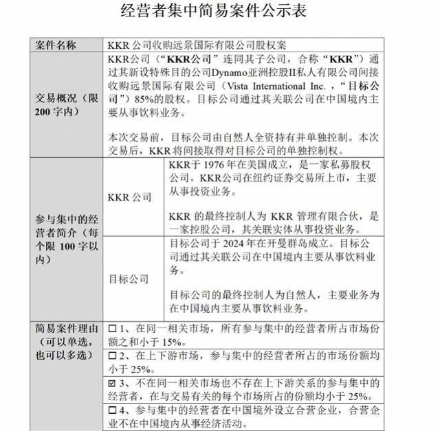 根据重庆市市场监督管理局此前发布的《KKR公司收购远景国际有限公司股权案》公示信息,KKR于1976年在美国成立,是一家私募股权公司,在纽约证券交易所上市,主要从事投资业务。KKR公司通过其新设特殊目的公司Dynamo亚洲控股II私人有限公司间接收购远景国际有限公司(Vista International Inc.,以下简称“目标公司”)85%的股权。