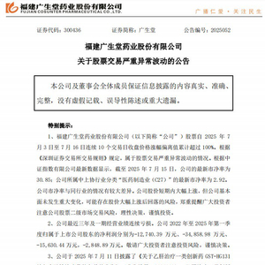 广生堂(300436)股价近期出现剧烈波动。根据公司公告,其股票自2025年7月3日至7月16日连续10个交易日收盘价格涨幅偏离值累计超过100%,触发严重异常波动情形。