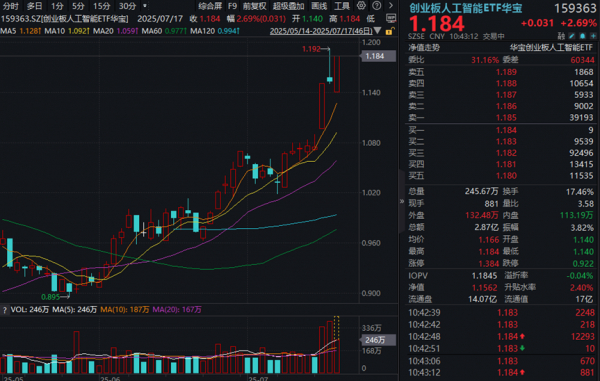 热门ETF方面,同标的指数规模最大、流动性最佳的$创业板人工智能ETF华宝(159363)场内价格继续涨2.69%,逼近前期高点,实时成交额超2.7亿元,环比放量明显,交投继续活跃!