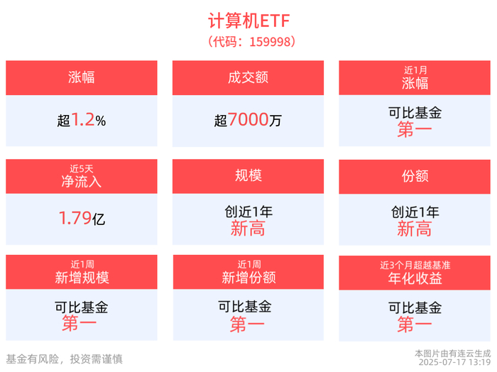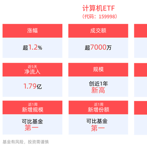 华为鸿蒙概念持续走强,全市场最大的计算机ETF(159998)上涨1.20%,盘中再获资金净申购,规模、份额续创新高!