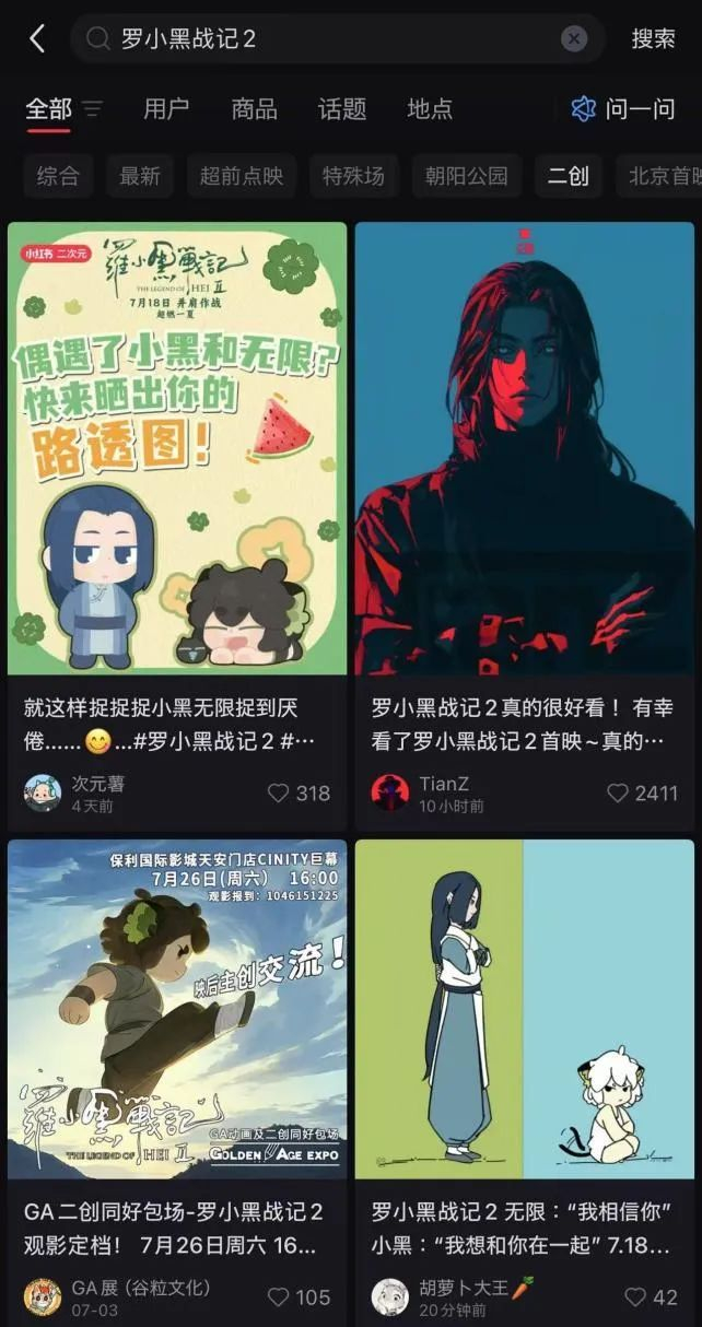 动画电影方面,小红书同样发挥出了高效能。《罗小黑战记2》还未正式公映就吸引大量粉丝自发创作相关内容,填补了官方宣发触达不到的“内容死角”。目前片方已经与小红书合作推出电影话题活动,将在热门笔记中随机送出电影周边,进一步引导粉丝参与创作、传播。