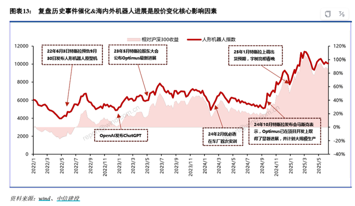 中信建投复盘机器人走势,发现事件催化&海内外产业链进展是股价变化的核心因素,行业主题性投资明显。整体来看,前期人形机器人指数涨跌主要受重要事件催化影响和T链进展影响。自2024年11月以来,国内人形机器人产业链进展与海外T链、科技大厂多重共振,共同推动板块上涨行情。海外机器人链以特斯拉、Figure等头部机器人公司、英伟达科技大厂为代表,国内机器人链宇树、智元等国内大厂为代表。