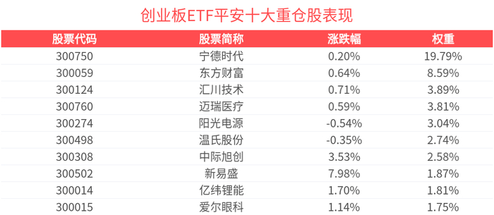 数据显示,截至2025年6月30日,创业板指数(399006)前十大权重股分别为宁德时代(300750)、东方财富(300059)、汇川技术(300124)、中际旭创(300308)、迈瑞医疗(300760)、新易盛(300502)、阳光电源(300274)、温氏股份(300498)、胜宏科技(300476)、亿纬锂能(300014),前十大权重股合计占比51.16%。