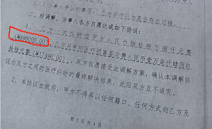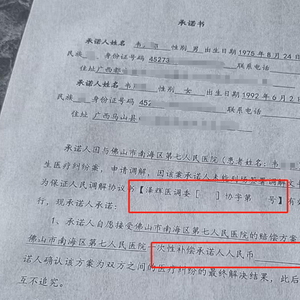 “我这才知道,5月17日邓某便在医调委,与南海第七医院签订了《调解协议书》,上面有写赔偿金额88.8万元。”韦先生说,5月23日前后,邓某让他签《承诺书》,系因为赔偿款到账了,但《承诺书》却没有写具体赔偿金额,“我认为他故意隐藏了该信息。”