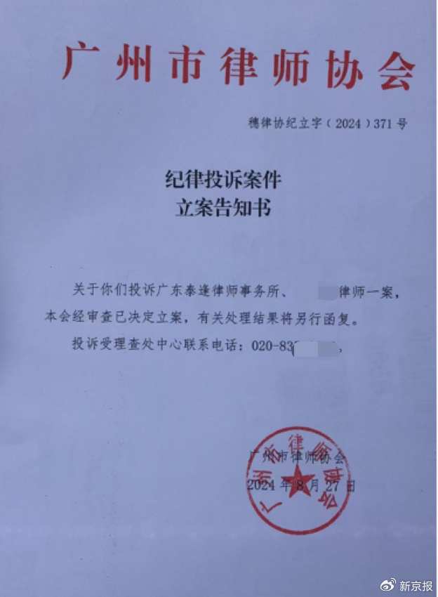 据悉,2024年8月27日,广州市律协对此事立案处理,至今尚无结果。