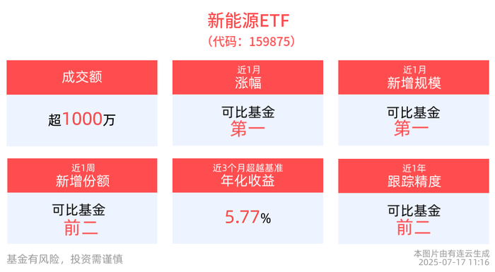 流动性方面,新能源ETF盘中换手1.31%,成交1163.67万元。拉长时间看,截至7月16日,新能源ETF近1年日均成交3602.99万元。