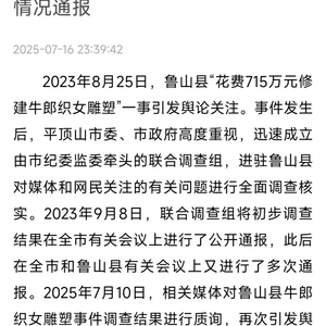 7月16日晚,平顶山市联合调查组再就“鲁山县花费715万元修建牛郎织女雕塑”一事发布情况通报: