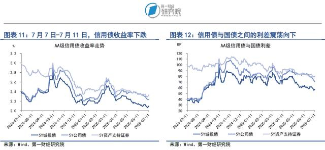 在7月7日至11日当周,多数品种信用债收益率下降。在AAA级债券中,5年期城投债、公司债和资产支持证券收益率分别下降2.06BP、1.36BP和1.69BP。在AA级债券中,5年期城投债、公司债和资产支持证券收益率分别下降3.08BP、4.98BP和1.64BP。