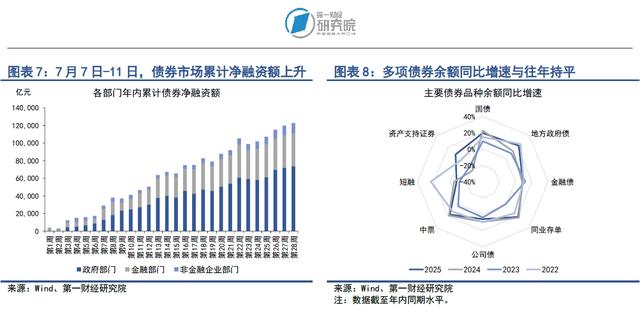 从债券余额增速来看,今年多项债券余额同比增速超过往年同期。截至7月11日,政府部门债券余额同比增速为21.2%,较2024年同期增速上升4.5个百分点;金融部门债券余额同比增速为12.9%,较2024年同期增速上升0.5个百分点;非金融企业部门债券余额同比增速为6%,较2024年同期增速上升1.7个百分点。