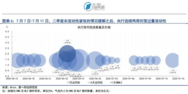 在7月7日至11日当周,随着二季度末流动性紧张的情况缓解,央行连续第二周通过逆回购回收过量流动性。上周,央行通过7天逆回购共投放资金4257亿元,共有6522亿元逆回购到期,净回笼资金2265亿元。