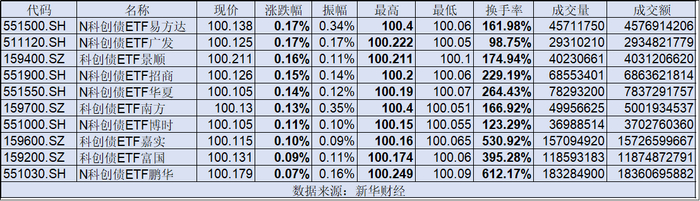 上市首日,所有科创债ETF均实现收涨,当日累计成交额超800亿元,其中科创债ETF易方达、科创债ETF广发等涨幅居前,均收涨0.17%;科创债ETF鹏华、科创债ETF嘉实换手率分别达到612.17%和530.92%。